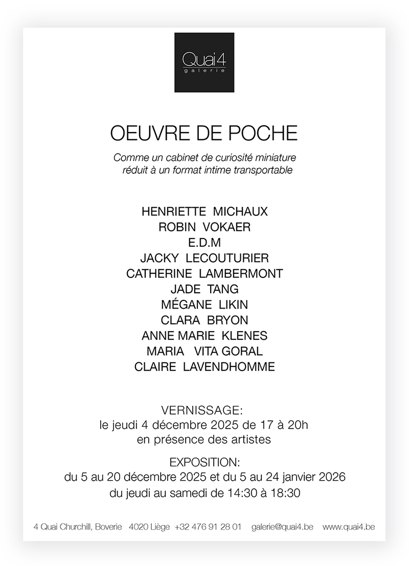 Accueil Du 05 au 20 Décembre 2025 – Exposition – Oeuvre de poche au Quai4 Galerie à LIEGE